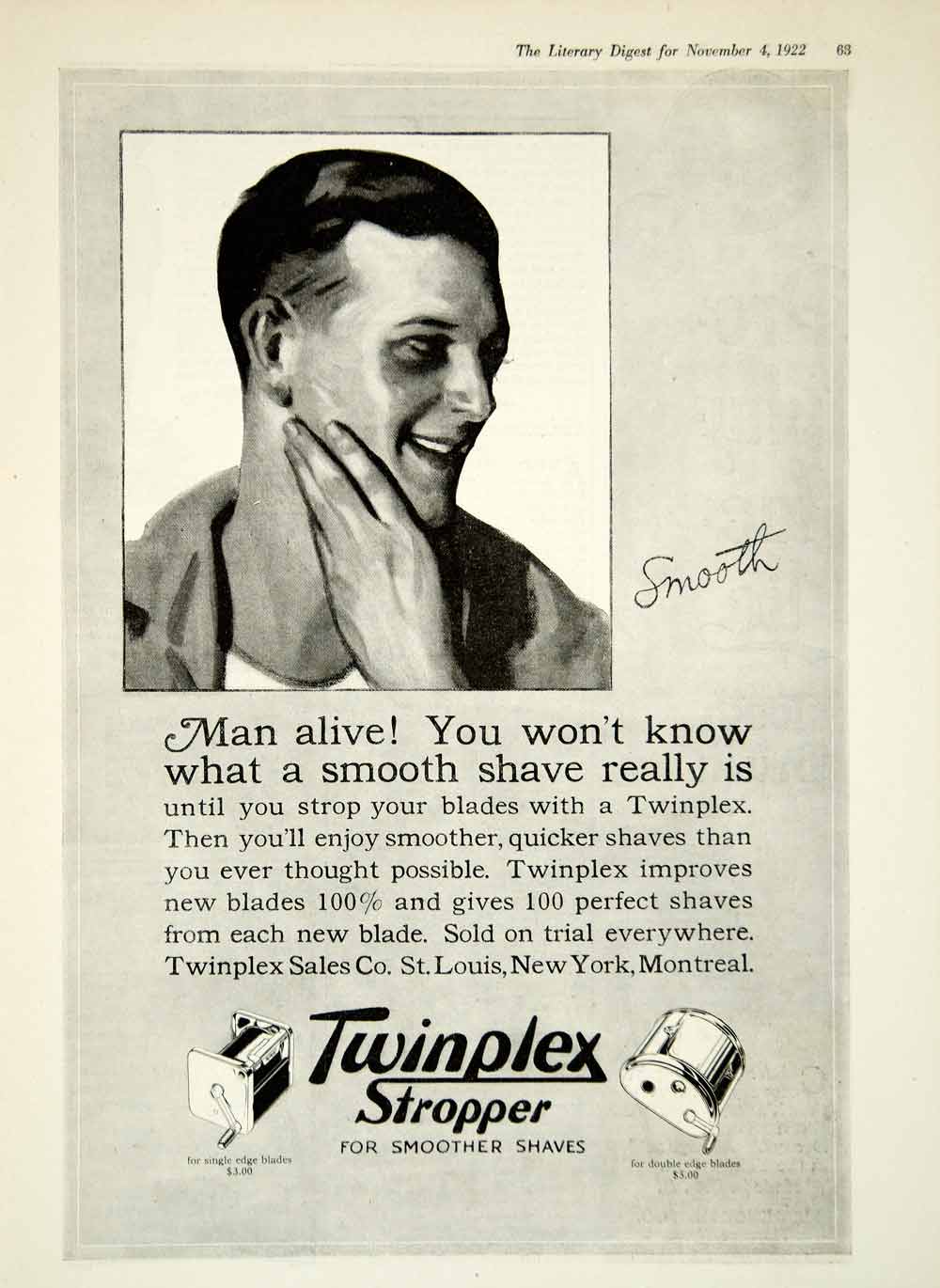 This is an original 1922 black and white print ad for Twinplex Stropper for smoother shaves.