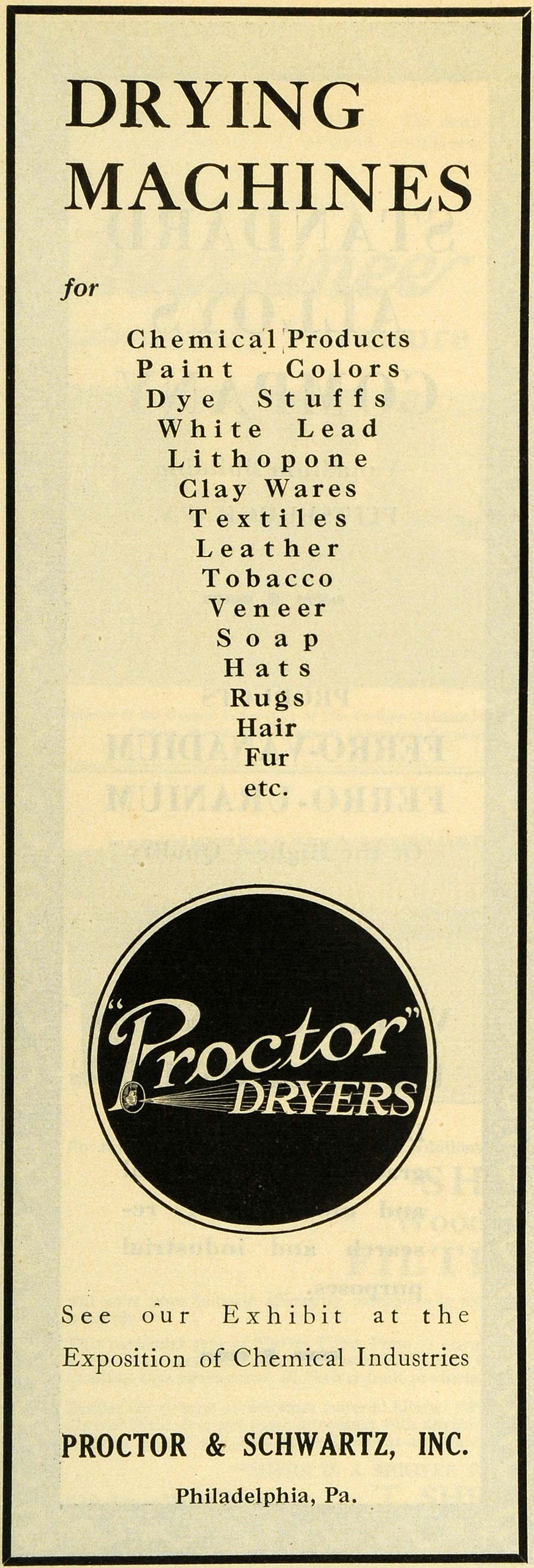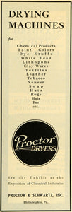 This is an original 1922 black and white print ad for Drying Machines for various purposes, a product line by Proctor and Schwartz, Inc. of Philadelphia, Pennsylvania.