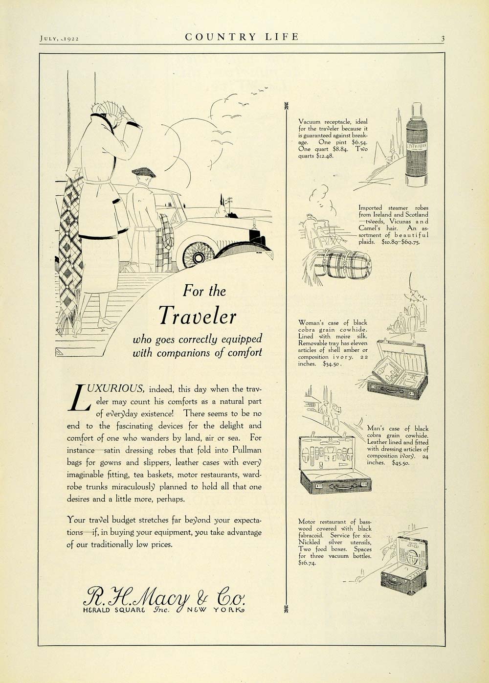 This is an original 1922 black and white print ad promoting the Vacuum receptacle, Importer Steamer Robes and Case of Black Cobra from R. H Macy and Company located in New York.
