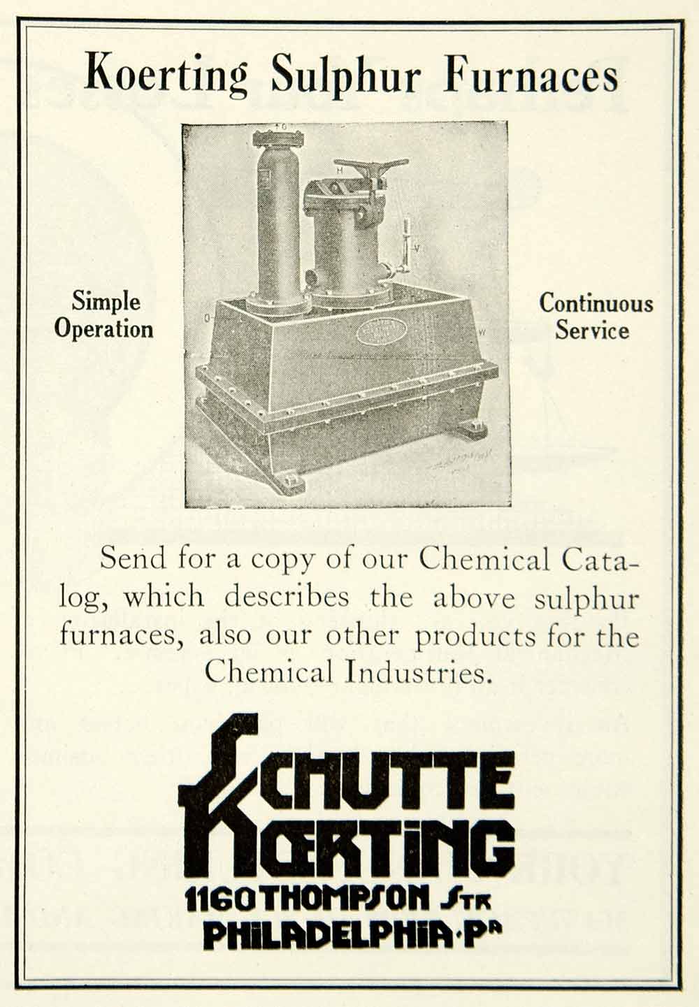 This is an original 1922 black and white print ad for the sulfur furnaces that were made and sold by Schutte Koerting of 1160 Thompson Street, Philadelphia, Pennsylvania (PA).