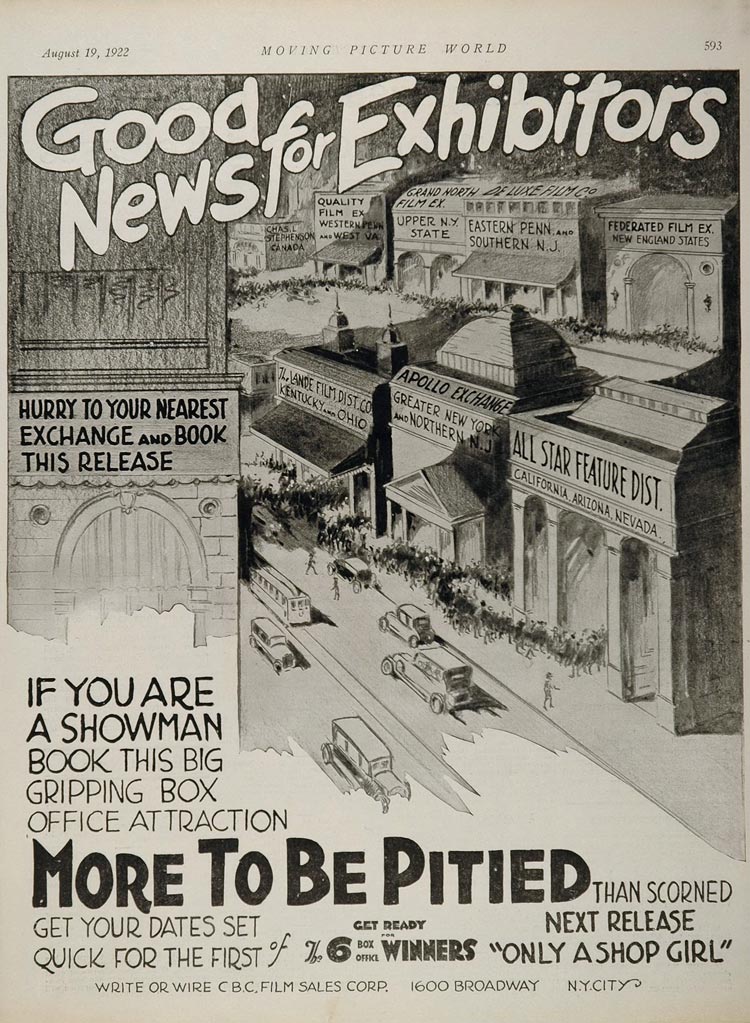 This is an original 1922 black and white print ad for the silent film "More to Be Pitied than Scorned," from the C. B. C. Film Sales, Corp., 1600 Broadway, New York, starring Rosemary Theby, Baby Josephine Adair, Alice Lake, J. Frank Glendon, Gordon Griffith, and Philo McCollough. Directed by Edward Le Saint from Charles E. Blaney's great Broadway success.