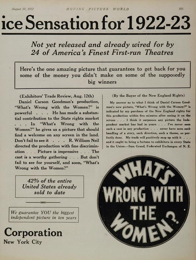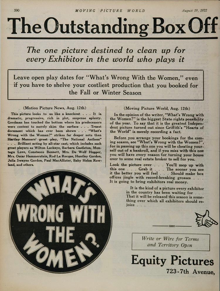 This is an original 1922 double-page, black and white print ad for Daniel Carson Goodman's silent film "What's Wrong with the Women," starring Wilton Lackaye, Barbara Castleton, Montagu Love, Mrs. De Wolf Hopper, Mrs. Oscar Hammerstein, Constance Bennett, Red LaRoque, Julia Swayne Gordon, and Huntley Gordon. An Equity Pictures release. Please see both images.