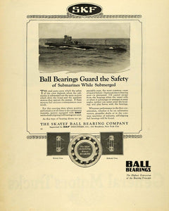 This is an original 1922 black and white print ad for ball bearings from the Skayef Ball Bearing Company of 165 Broadway, New York City. Shown in the illustration is a submarine; the caption writes, "The vital parts upon which the safety of the crew depends when the submarine is submerged are the main motors which drive the vessel and the auxiliary motors that operate the pumps. If these motors fail serious consequences may result..."