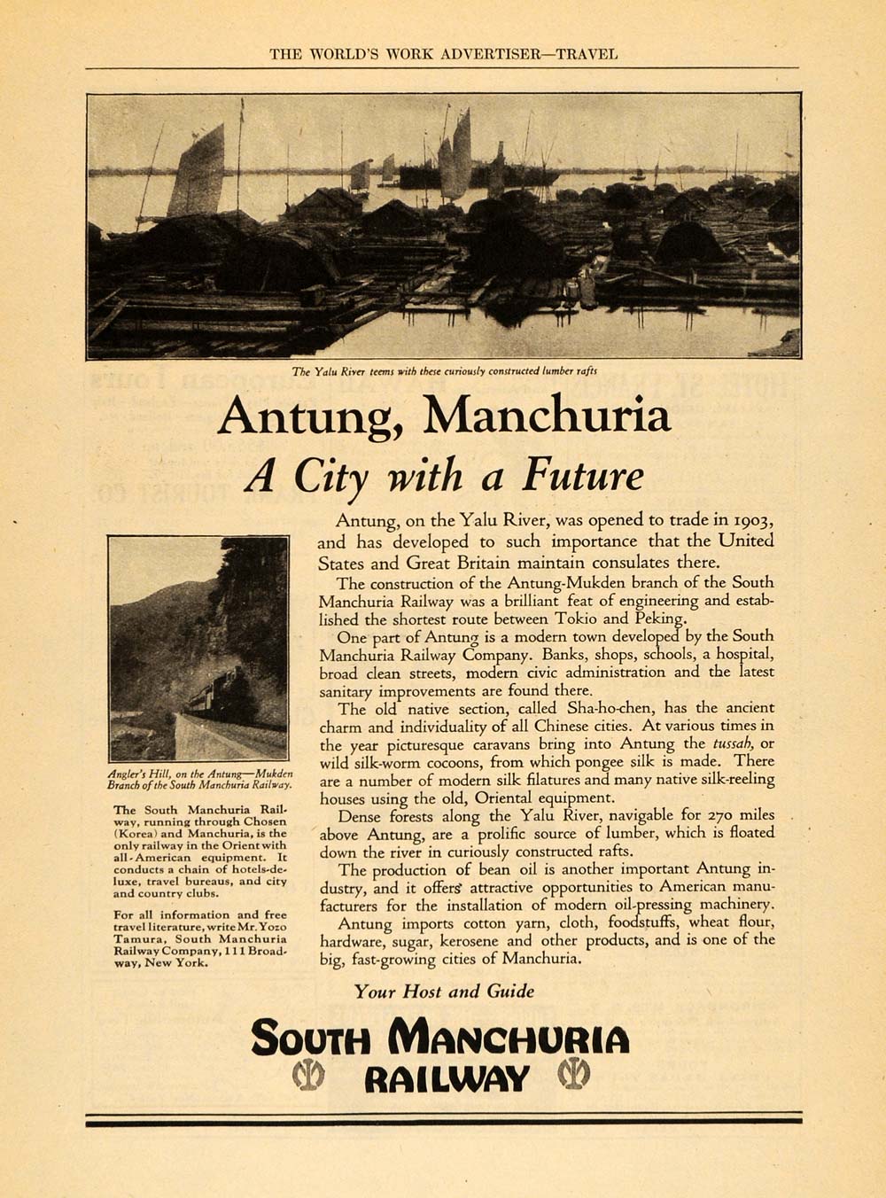 This is an original 1922 black and white print ad for the South Manchuria Railway. The ad features images of the Yalu River and Angler's Hill on the Antung.