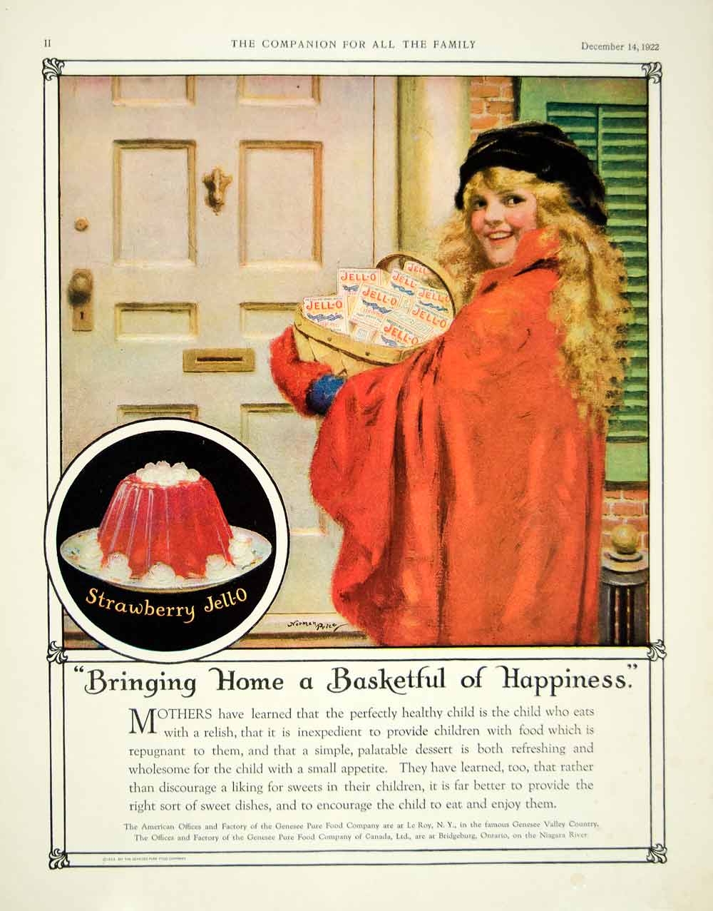 This is an original 1922 color print ad for strawberry flavored Jell-O that was made and sold by the Genesee Pure Food Company of Le Roy, New York (NY). The ad also featured artwork by Norman Price.