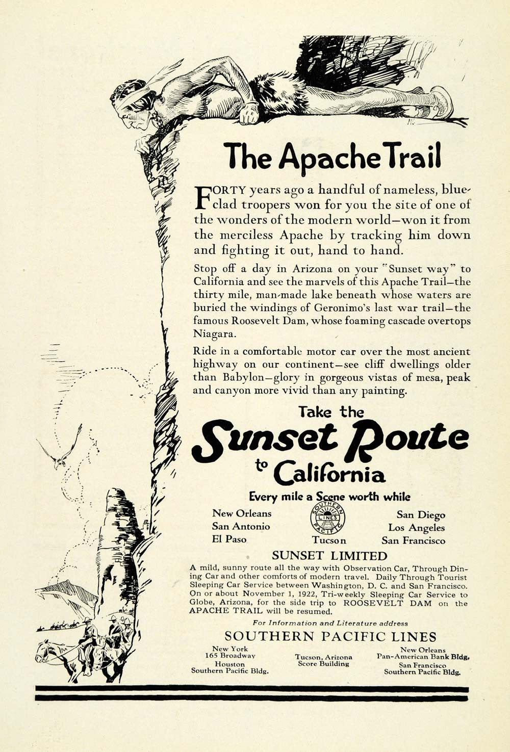 This is an original 1922 black and white print ad for the Sunset Limited from Southern Pacific Lines Railroad.