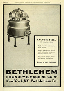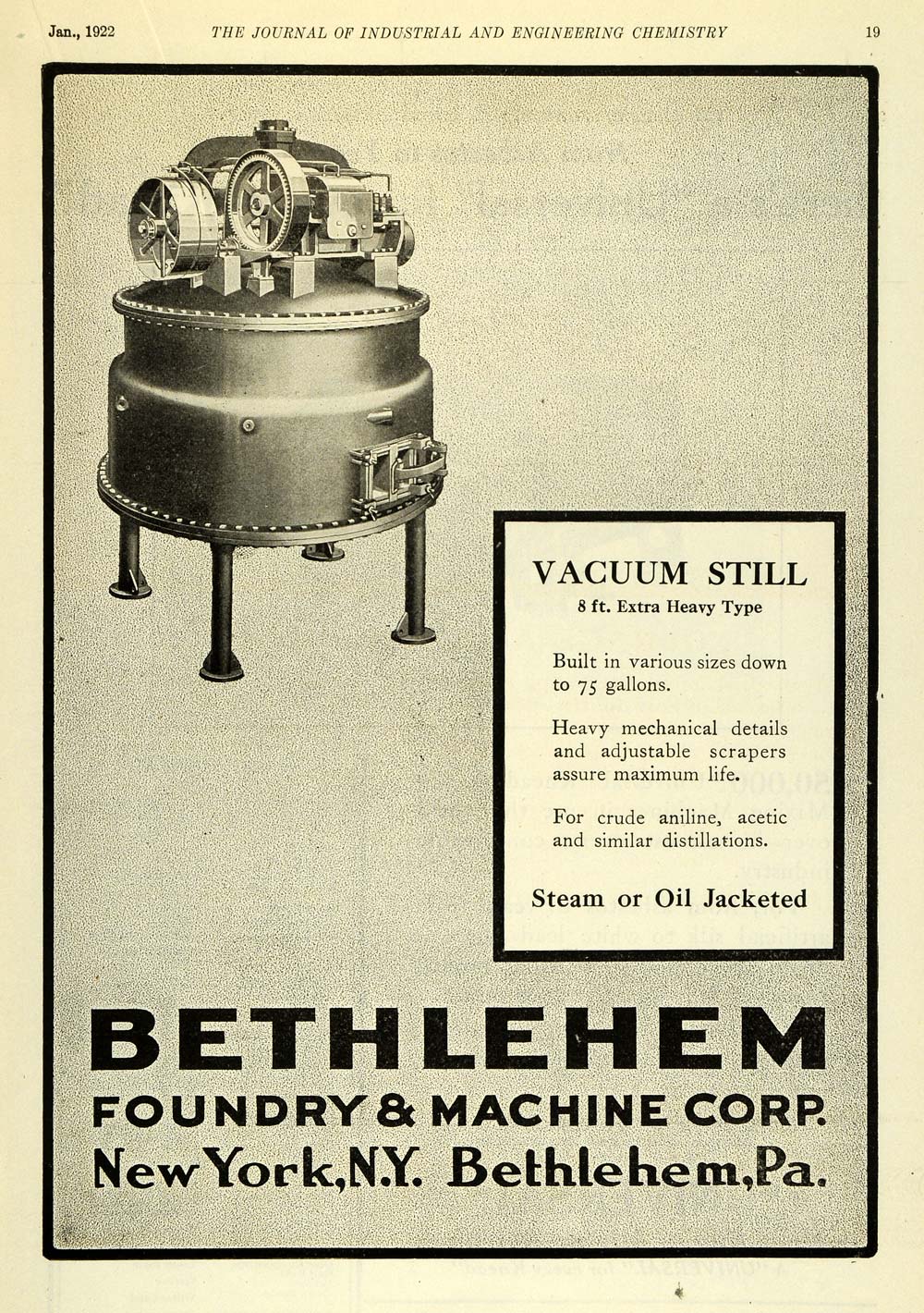 This is an original 1922 black and white print ad for the Vacuum Still, a product by the Bethlehem Foundry and Machine Corporation.