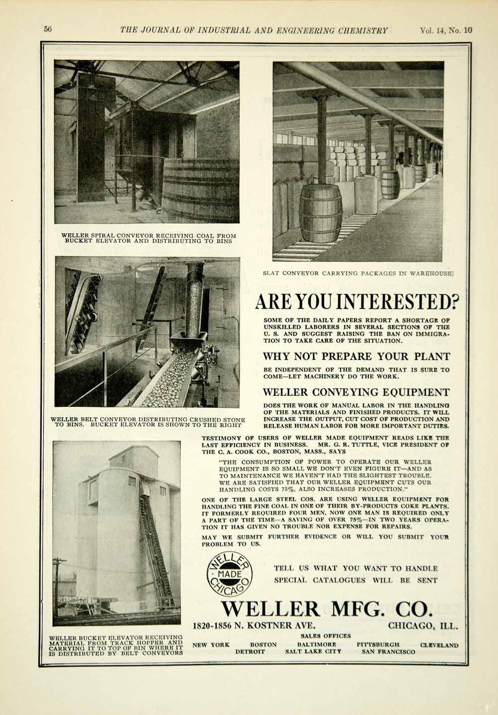 This is an original 1922 black and white print ad for the spiral, slat, and belt conveyors and bucket elevators that were made and sold by the Weller Manufacturing Company of 1820-1856 North Kostner Avenue, Chicago, Illinois (IL).