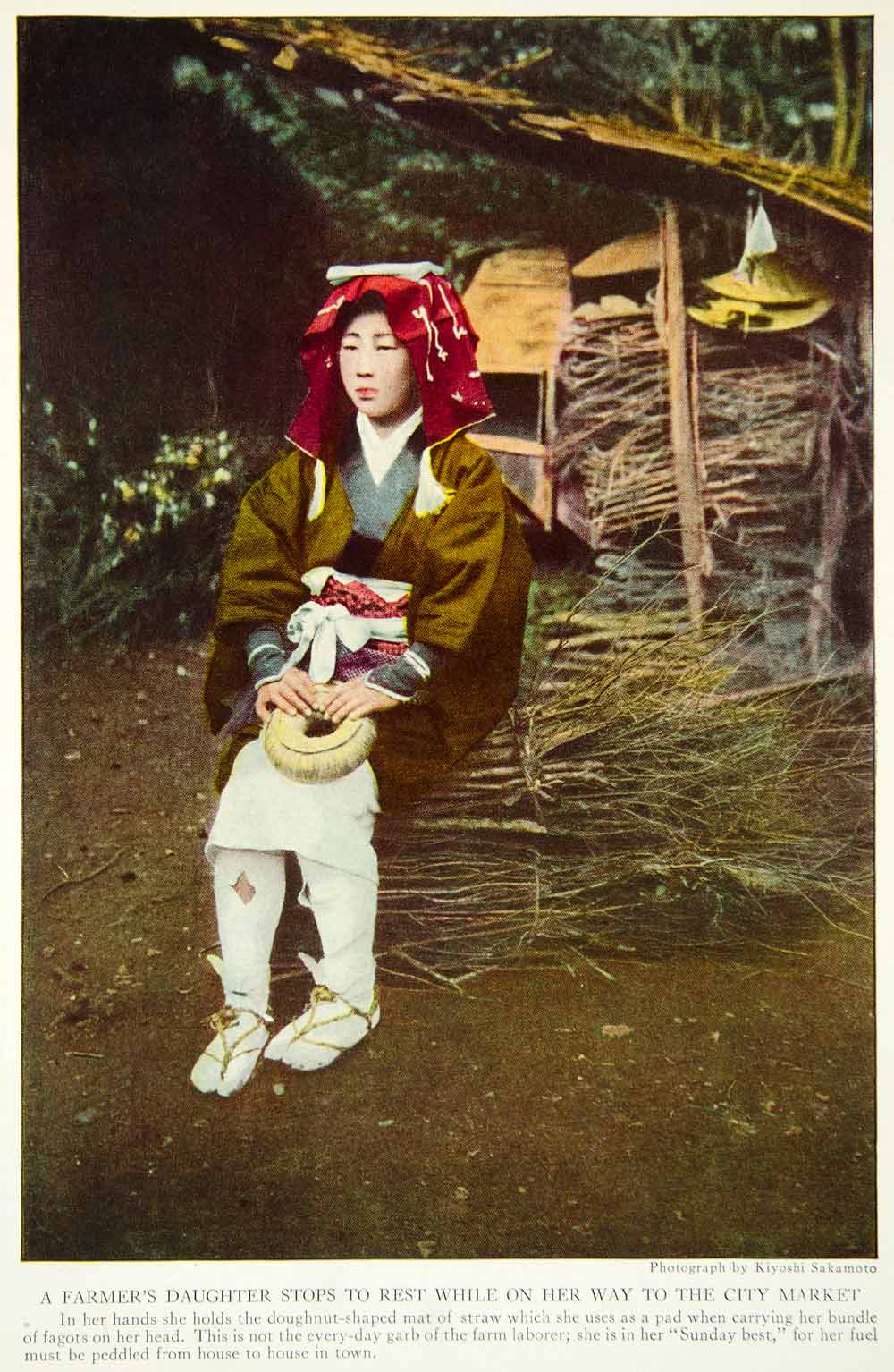 This is an original 1922 color print of a Japanese girl resting on her way to the city market, wearing traditional garb.