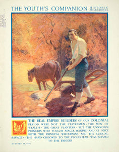 This is an original 1922 color cover for The Youth's Companion magazine, October, 12, 1922 that featured artwork by William D. Eaton that portrayed an American pioneer preparing to defend his farmland from an Indian attack.