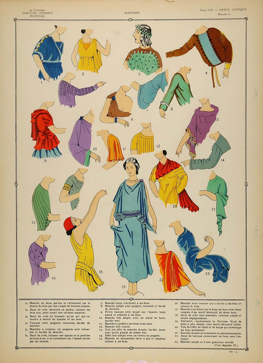 This an original 1922 pochoir print with details of the sleeves of the clothing worn by the women of ancient Greece.