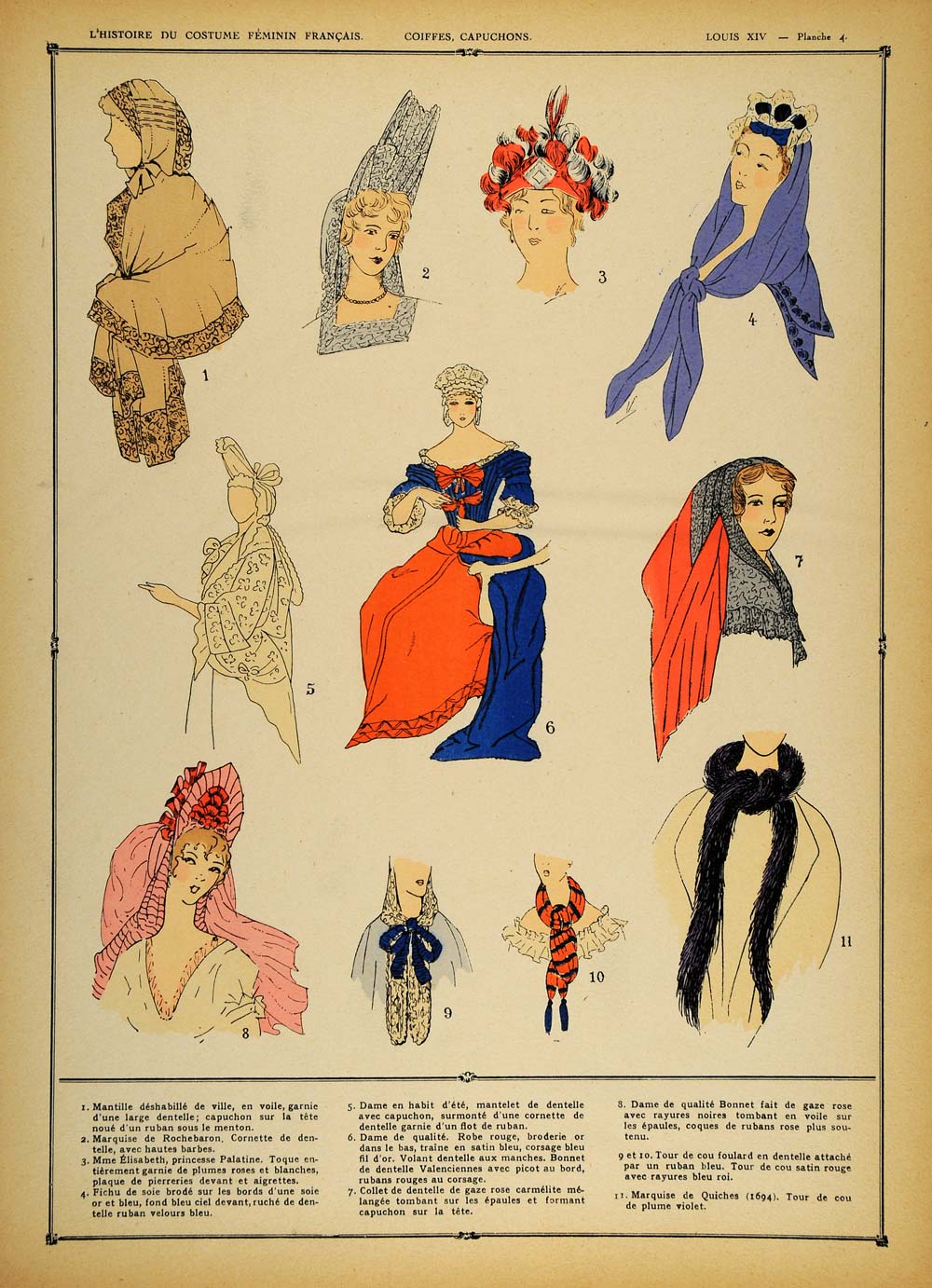 This an original 1922 pochoir print of caps (coiffes, capuchons) worn by upper-class French women during the reign of Louis XIV (1574 - 1643).