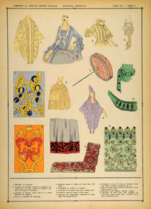 This an original 1922 pochoir print of a variety of embroidered fabric designs and lace (broderies, dentelles) adorning the dresses worn by upper-class French women during the reign of Louis XIV (1574 - 1643). Please note that fig. 10 has applied gold ink which appears brown in our digital image. Fig. 12 has applied silver ink which appears gray in our digital image.