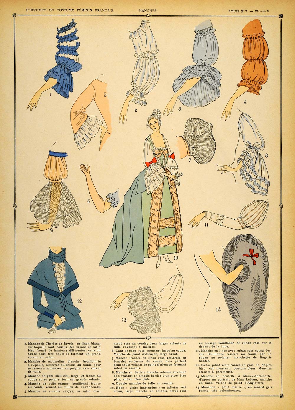 This an original 1922 pochoir print of the various sleeves of the dresses worn by upper-class French women during the reign of Louis XVI (1774 - 1792).