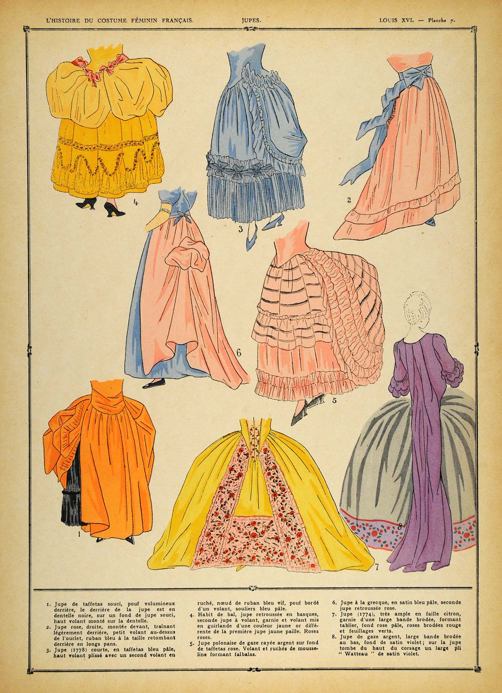 This an original 1922 pochoir print of the skirts (jupes) of the dresses worn by upper-class French women during the reign of Louis XVI (1774 - 1792). Please note that figs. 5 and 8 have applied silver ink which appears gray in our digital image.