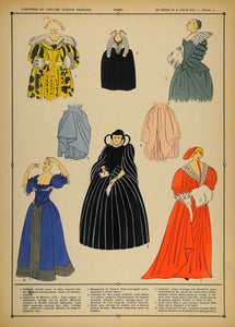 This an original 1922 pochoir print of the fashionable attire of royal and upper-class French women during the reigns of Henri III and Louis XIII (1574 - 1643), including that of Catherine de' Medici (fig. 2) and Marguerite de France (fig. 3).