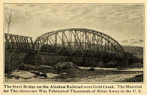 This is an original 1922 halftone print of the steel bridge on the Alaskan Railroad that goes over Gold Creek; the metals for the bridge's structure came from other regions of the United States, thousands of miles away.