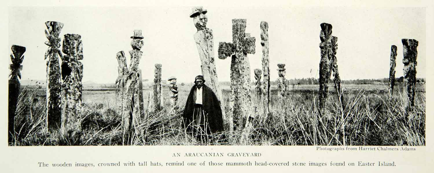 This is an original 1922 black and white halftone print of an Araucanian Grave Yard. The Araucans, also known as the Mapuche, are an indigenous tribe from south-central Chile.