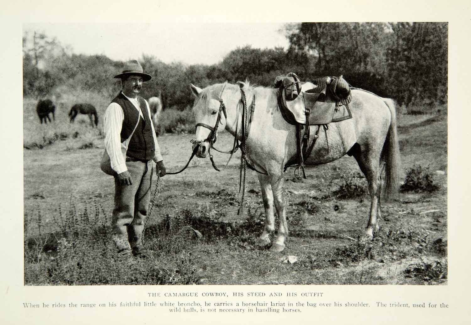 This is an original 1922 black and white halftone print of the Camargue Cowboy and his camargue horse in France.
