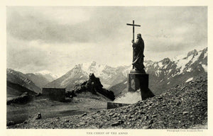 This is an original 1922 halftone print of Christ the Redeemer of the Andes mountains. The statue was unveiled in March of 1904 after a dispute between Chile and Argentina. Photography by Armando Pero.