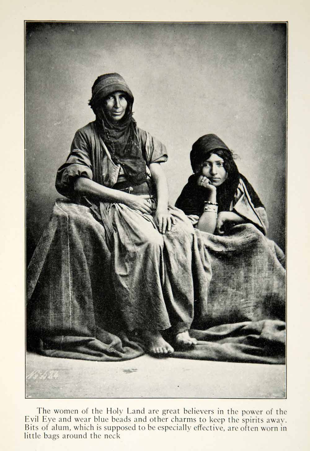 This is an original 1922 monochrome halftone print of two women from the Holy Land. Apparently, belief in the Evil Eye was common at the time, and women would were blue beads and small bags of alum in order to keep the spirits away.