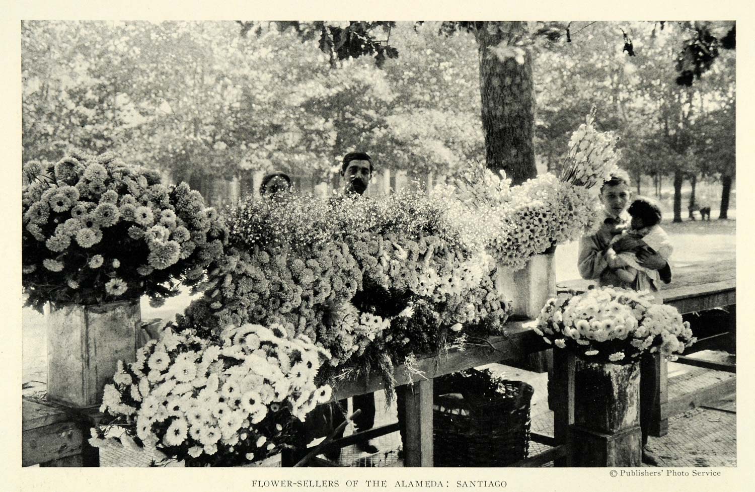This is an original 1922 halftone print of a street vendor selling flowers on the Avenida de las Delicias in Santiago, Chile.