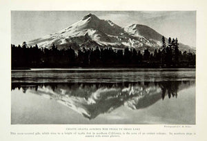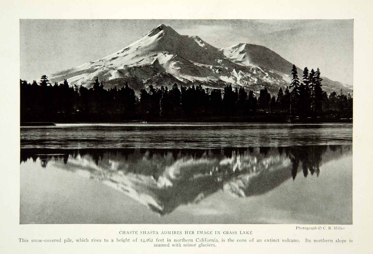 This is an original 1922 black and white halftone print of Chaste Shasta in Northern California situated behind Grass Lake.