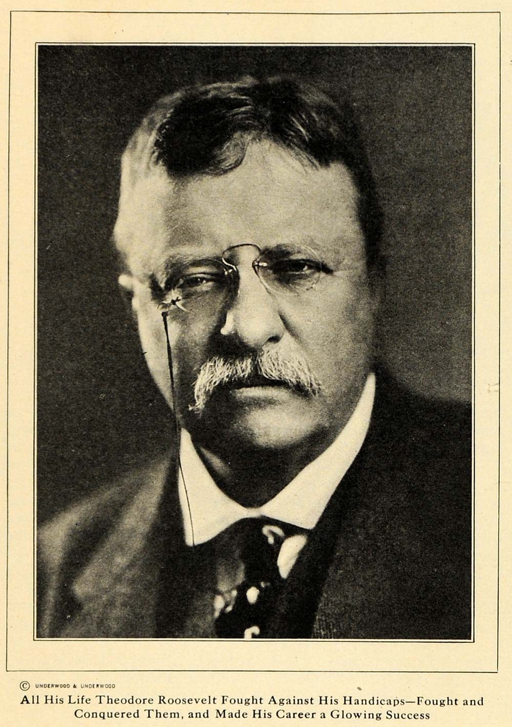 This is an original 1922 halftone print of President Theodore Roosevelt, who fought through all of his health ailments (bad eyesight and asthma, for example) and had an extremely achieved and successful career (image credit to Underwood & Underwood).