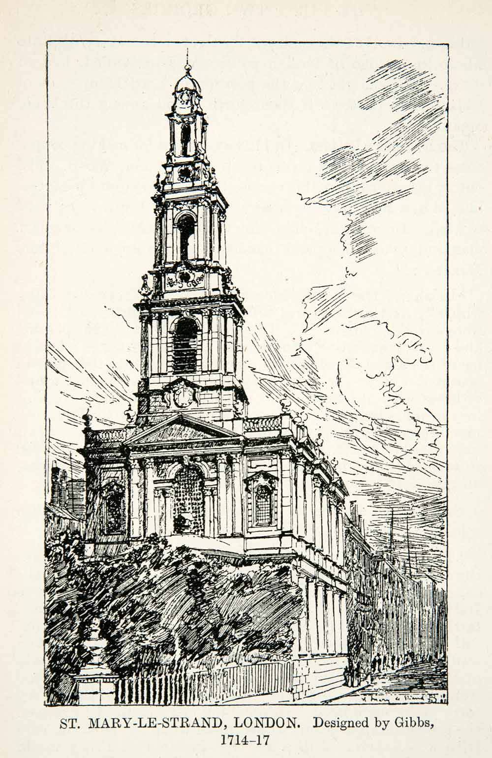 This is an original 1922 black and white relief line-block print of the church of St. Mary le Strand in London, England.