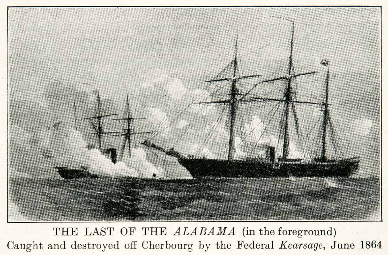 This is an original 1922 black and white halftone print of the CSS Alabama before it was destroyed by the USS Kearsage in Cherbourg.