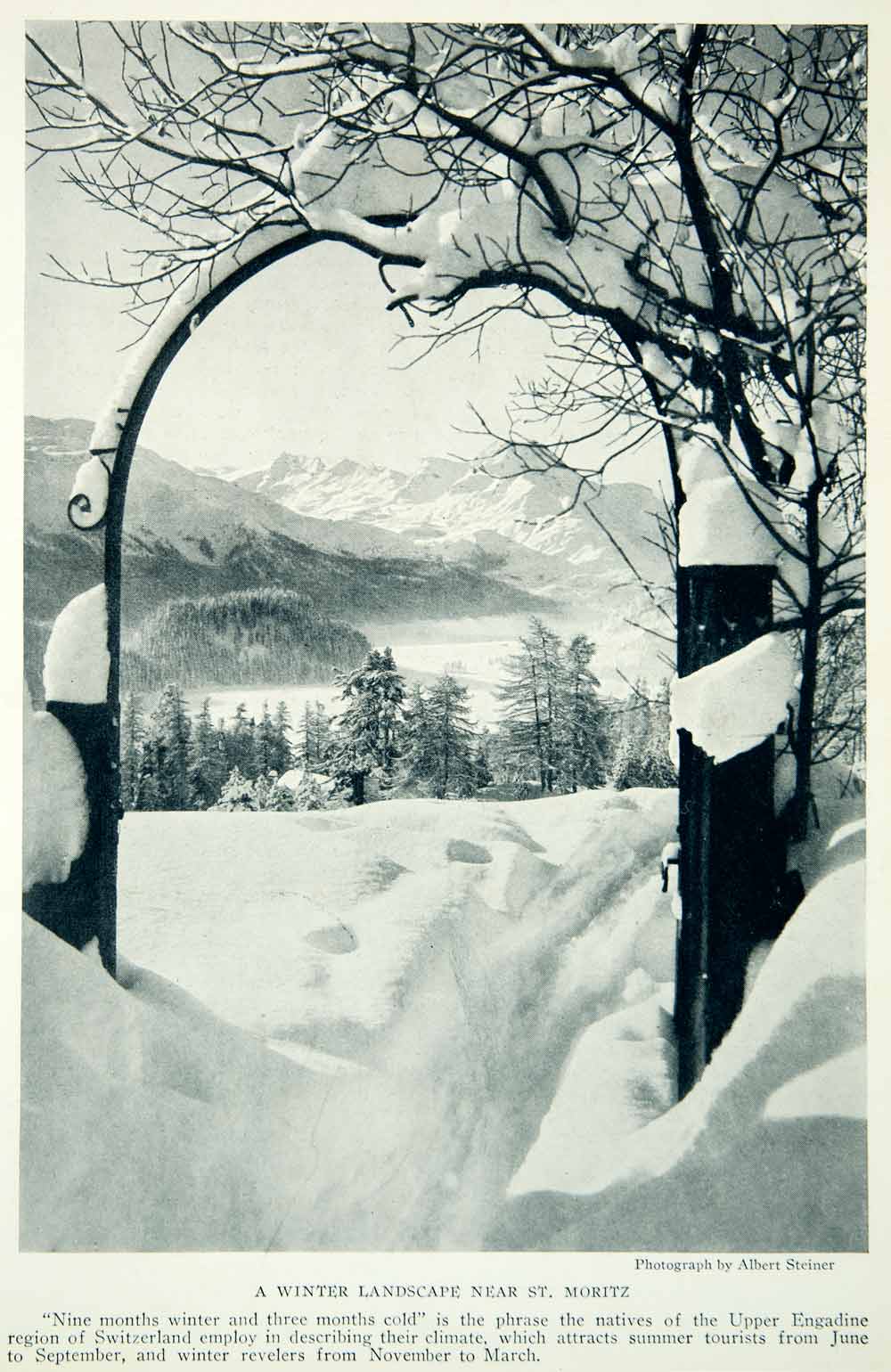 This is an original 1922 duotone halftone print of a snowy winter scene near St. Moritz, Switzerland.