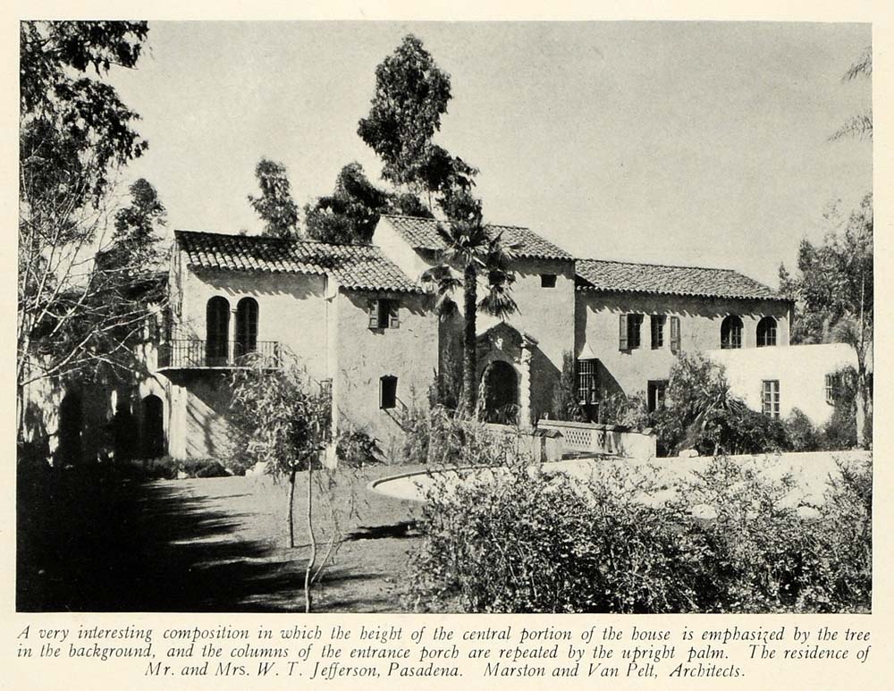 This is an original 1922 halftone print of the home of Mr. and Mrs. W. T. Jefferson in Pasadena, California. This home was designed by architects Marston and Van Pelt.