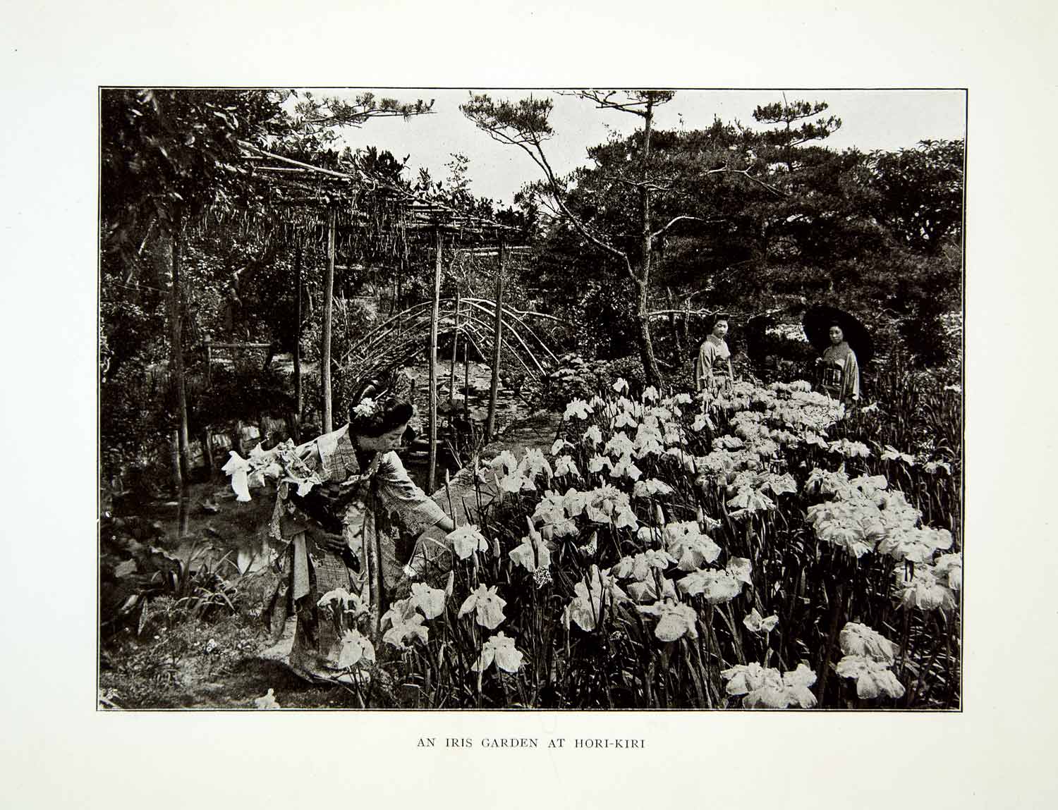 This is an original 1922 black and white halftone print of a woman plucking irises in the Horikiri area of Tokyo, Japan.