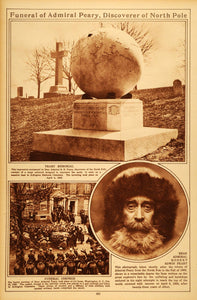 This is an original 1922 sepia rotogravure of the funeral of Admiral Robert Edwin Peary, the discoverer of the North Pole, and the explorer of the Arctic. Peary claimed to have reached the North Pole in April of 1909, but his claim has been widely doubted today since no one else onboard his ship had any navigational skills, and could not confirm or contradict Peary's work. Shown in the image is his grave site, his funeral cortege at his home in Washington, D. C., and a portrait of the explorer.