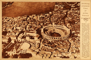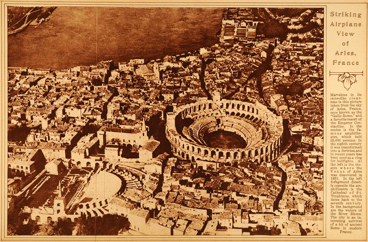 This is an original 1922 sepia rotogravure of an aerial view of Arles, France (Republique Fran&3231;aise). Shown in the image is the amphitheatre, the Cathedral of St. Trophimus and the Rhone river. The caption writes, "At the left is the theatre where the Venus of Arles was discovered in 1651."