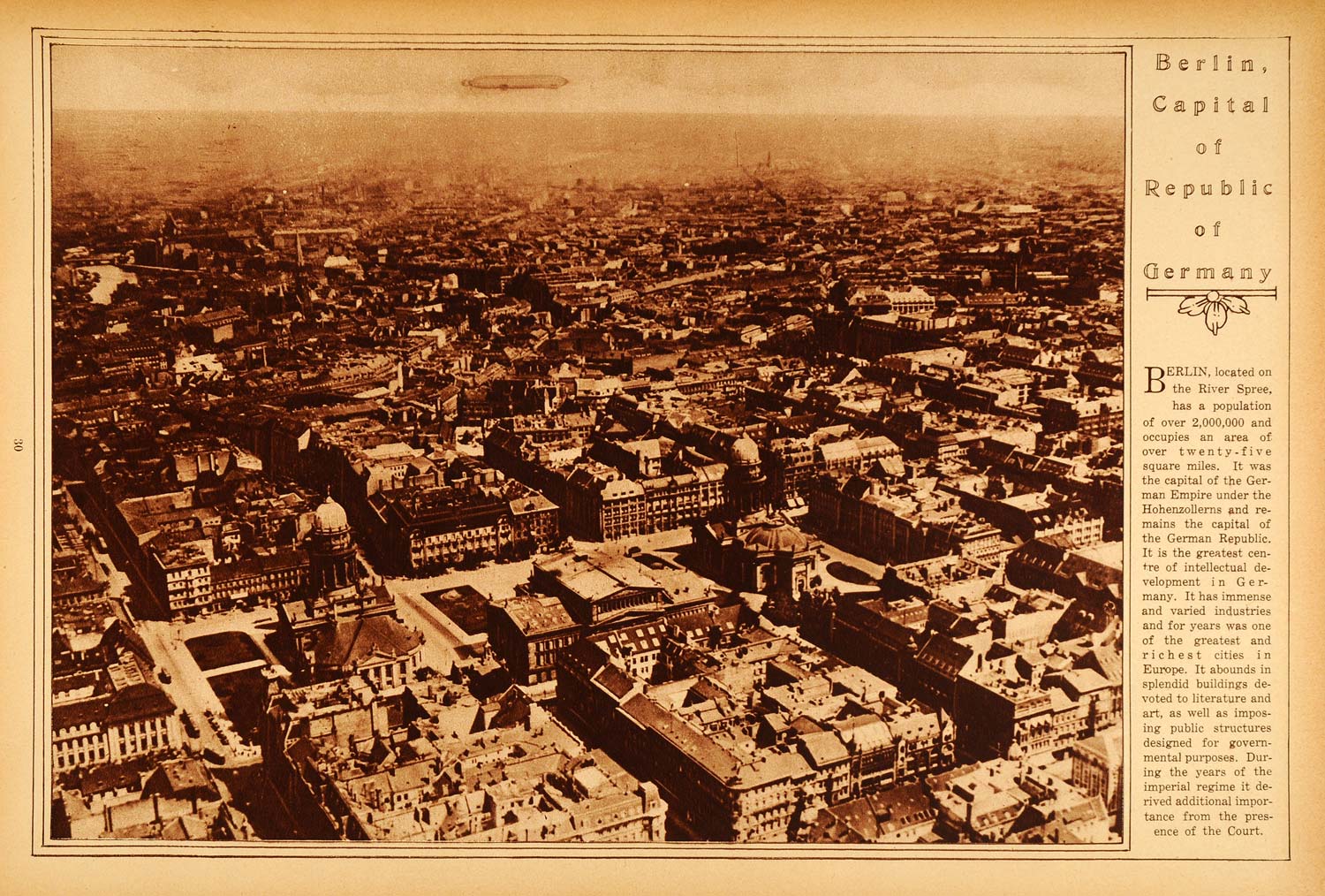 This is an original 1922 sepia rotogravure of an aerial view of Berlin, Germany (Deutschland). Shown in the background is an airship floating above the city.
