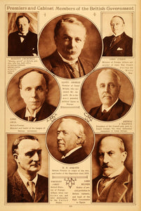 This is an original 1922 sepia rotogravure of portraits of premiers and cabinet members of the British government. Shown are portraits of Winston Churchill, Lloyd George, Lord Curzon, Arthur J. Balfour, Lord Cecil, H. H. Asquith, Viscount Grey, and Lord Milner.