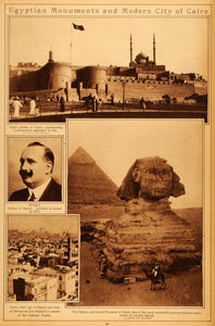 This is an original 1922 sepia rotogravure of the Saladin Citadel of Cairo, a medieval Islamic structure, built between 1176 and 1183 AD. Also shown is a portrait of Fuad I, who served as the Sultan of Egypt from 1917-1922, and as the King of Egypt from 1922 to 1936. A cityscape of Cairo can also be seen as well as the Sphinx and a pyramid at Giza. Sphinxes were generally used in association with royal tombs and temples. The Great Sphinx of Giza is the oldest known sculpture, dating back to 2558-2532 B. C., and it is the largest monolith sculpture in the world.