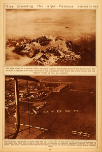 This is an original 1922 sepia rotogravure of a British airplane crossing the highest peaks of the Italian Alps. The bottom image shows the Croydon Aerodrome, of London, England as seen from the air.