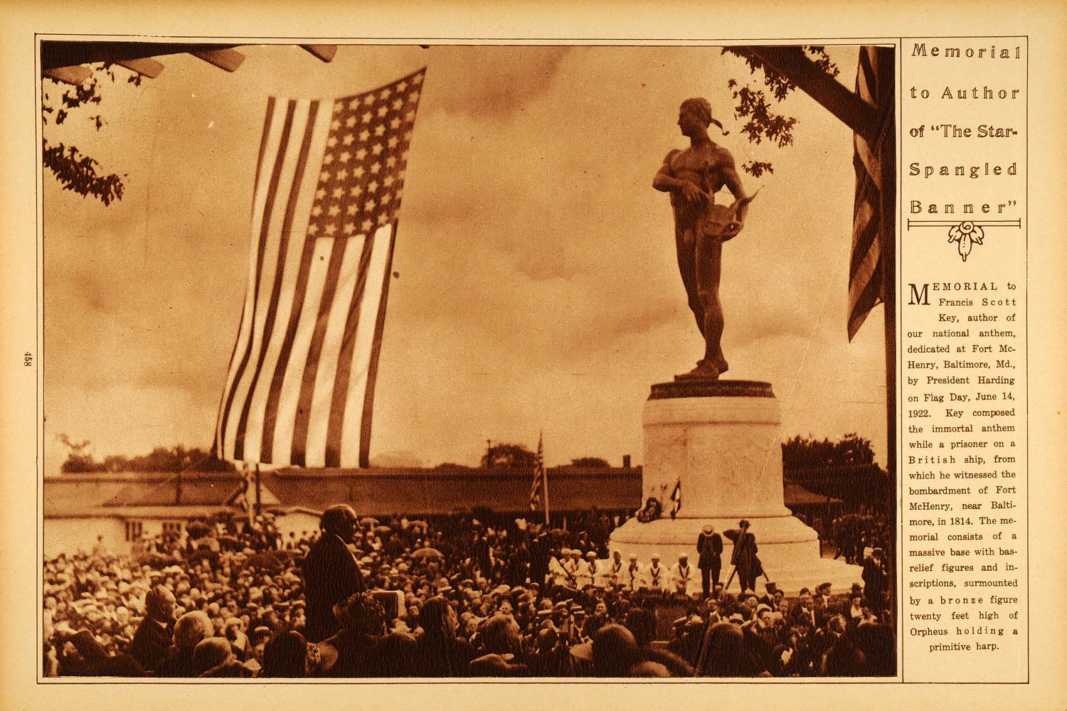 This is an original 1922 sepia rotogravure of the memorial for Francis Scott Key, the author of the "Star Spangled Banner." President Harding dedicated the memorial at Fort McHenry in Baltimore, Maryland. The caption writes, "Key composed the immortal anthem while a prisoner on a British ship, from which he witnessed the bombardment of Fort McHenry, near Baltimore, in 1814. The memorial consists of a massive base with bas-relief figures and inscriptions, surmounted by a bronze figure twenty feet high of Orpheus holding a primitive harp."
