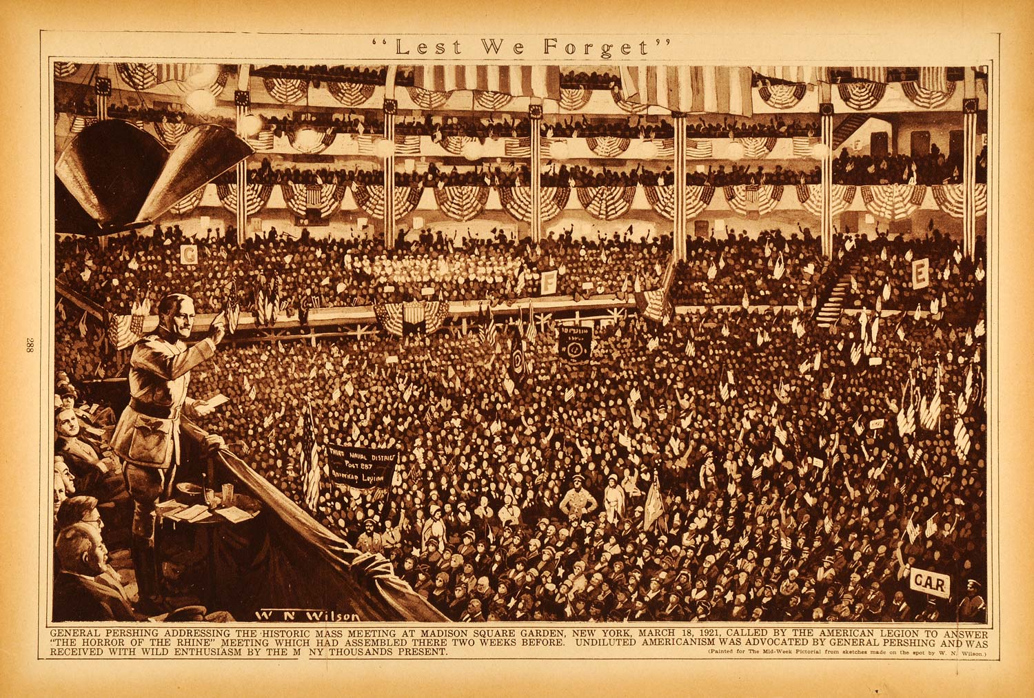 This is an original 1922 sepia rotogravure of a painting of General Pershing addressing a meeting at the Madison Square Garden of New York. The caption writes, "[the meeting] was called by the American Legion to answer 'the Horror of the Rhine' meeting which had assembled there two weeks before. Undiluted Americanism was advocated by General Pershing and was received with wild enthusiasm by the many thousands present."