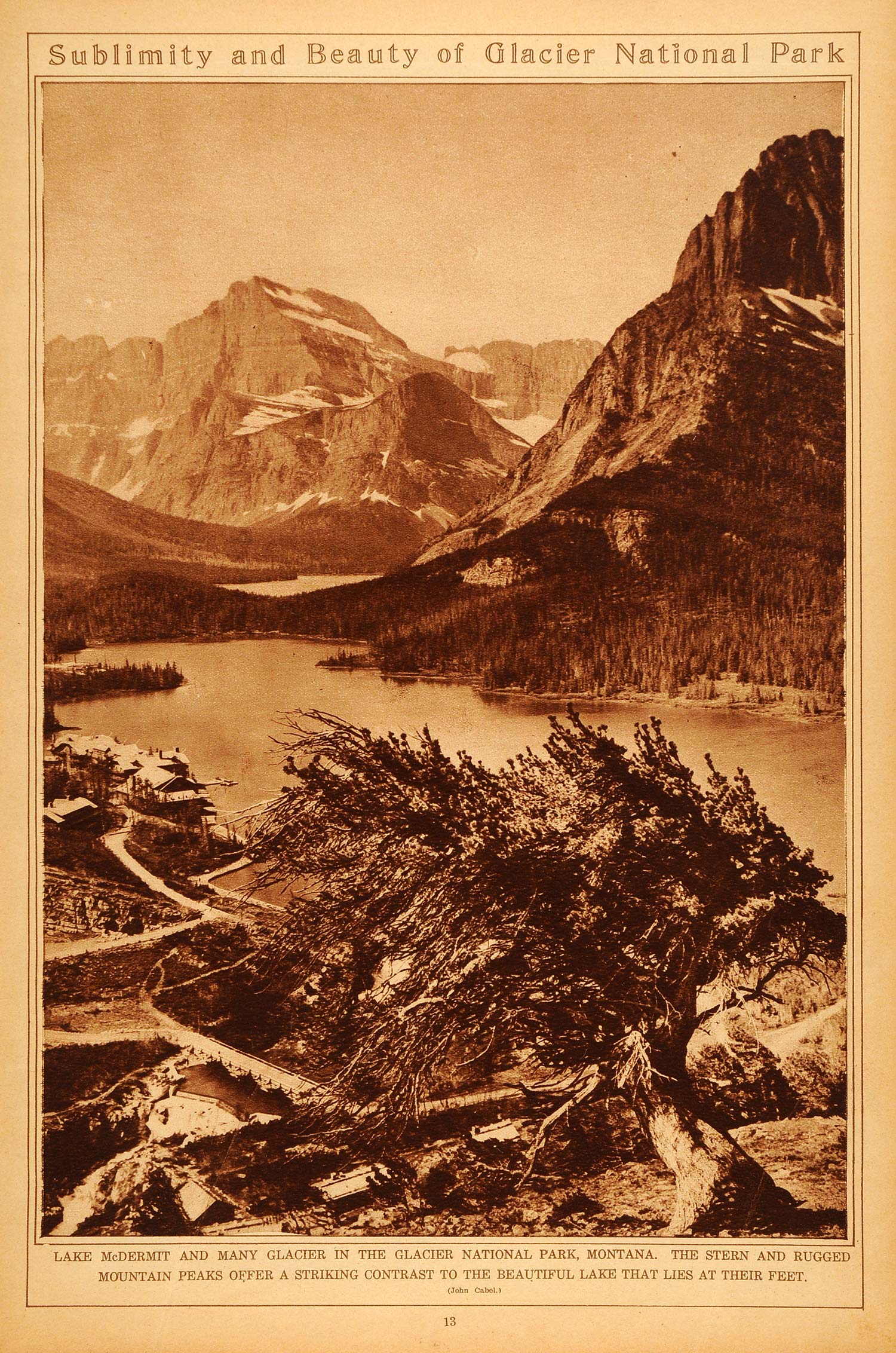 This is an original 1922 sepia rotogravure of Lake McDermott at Glacier National Park. The park is located in Montana, and in the Canadian provinces of British Columbia and Alberta. It encompasses over a million acres, and has over 130 lakes. Based on photographs taken throughout the past century, geologists say that the 25 glaciers in the park may be gone by 2030. In 1850, the park was said to have around 150 glaciers. Blackfoot Glacier, the second largest glacier in the park, lost over 23% of its surface area from 1966 to 2005.