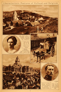 This is an original 1922 sepia rotogravure of a small fishing village in Soutelaude, Holland; Queen Wilhelmina of the Netherlands, who served for fifty-seven years between 1890-1948; a Dutch woman with her dog-team; the Palace of Justice in Brussels; and Albert I, the King of Belgium from 1909 to 1934. The woman with the dogs was traveling around the outskirts of Enkhuysen (Enkhuizen?), Netherlands.