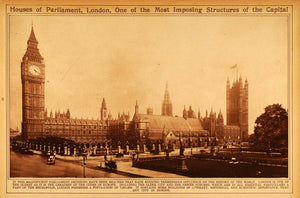 This is an original 1922 sepia rotogravure of the Houses of Parliament in London, England. The caption writes, "London is one of the oldest as it is the greatest of the cities of Europe. Including the older city and the newer suburbs, which are in all essential particulars a part of the metropolis, London possesses a population of 7,251,358. It contains more buildings of literary, historical and scientific importance than any city in Europe."
