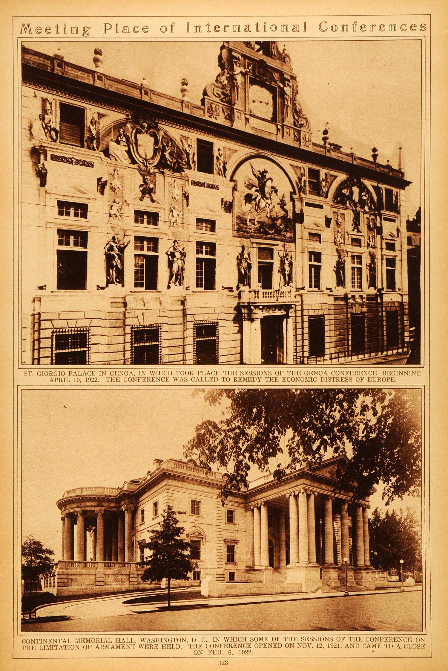 This is an original 1922 sepia rotogravure of St. Giorgio Palace in Genoa, Italy and Memorial Hall in Washington, D. C. The caption for the top image writes, "St. Giorgio Palace in Genoa, in which took place the sessions of the Genoa Conference, beginning April 10, 1922. The conference was called to remedy the economic distress of Europe."