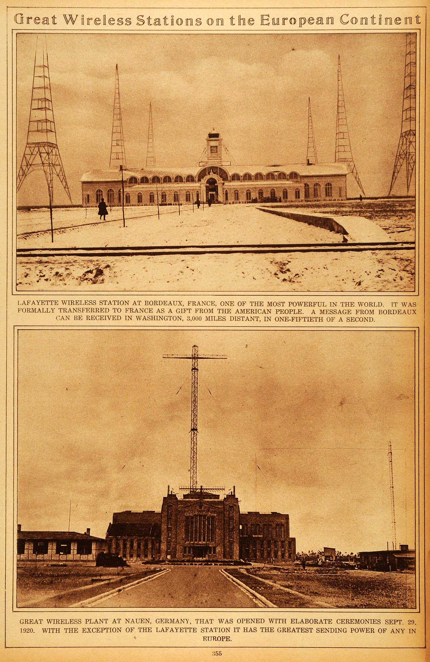 This is an original 1922 sepia rotogravure of a wireless station in Bordeaux, France (Republique Française) and a plant in Nauen, Germany (Deutschland). The caption for the French station writes, "It was formally transferred to France as a gift from the American people. A message from Bordeaux can be received in Washington, 3,000 miles distant, in one-fiftieth of a second."