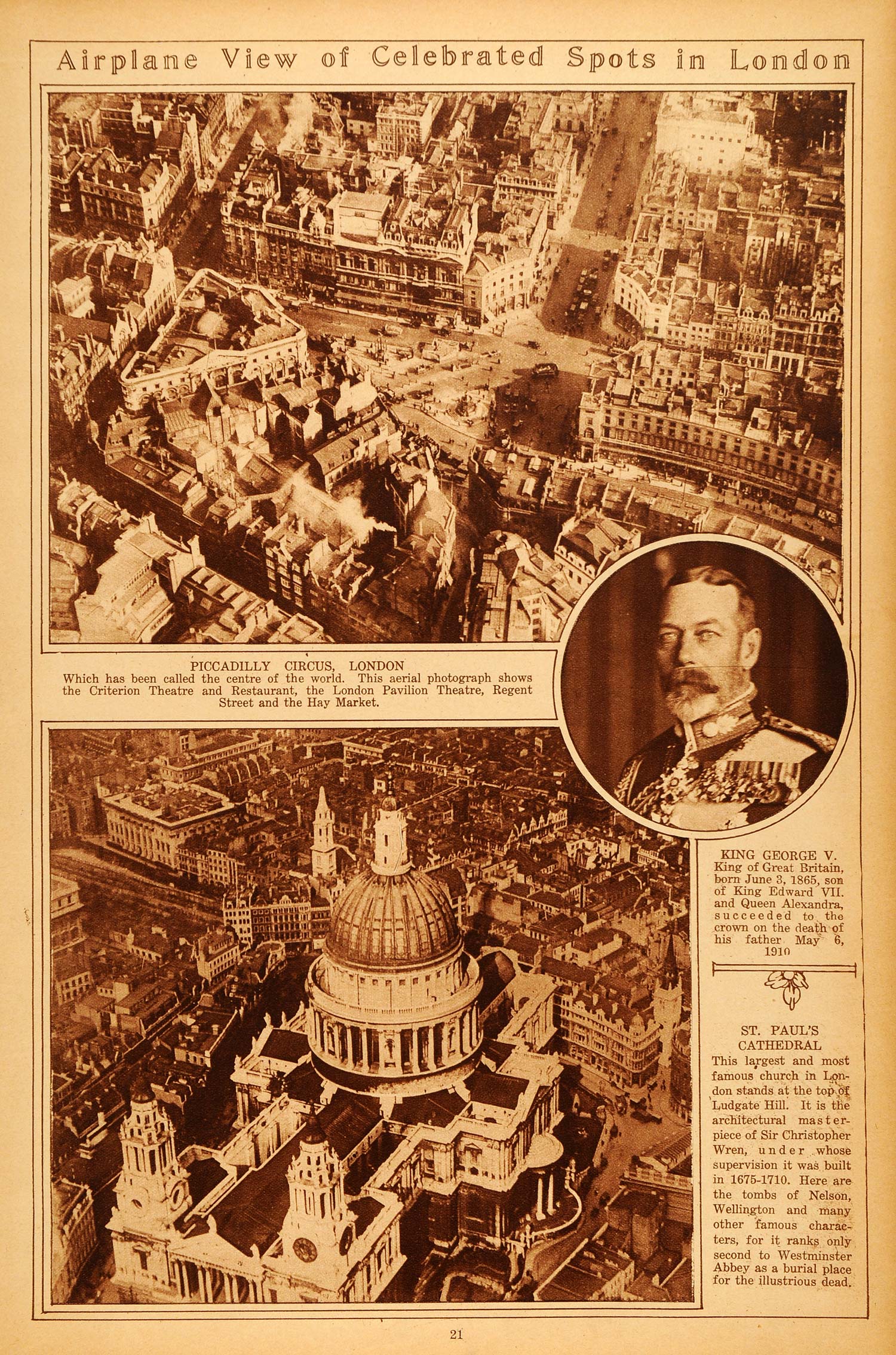 This is an original 1922 sepia rotogravure of an aerial view of London, a portrait of King George V, and St. Paul's Cathedral. The top image shows the Criterion Theatre and restaurant, the London Pavilion Theatre, Regent Street and the Hay Market. St. Paul's Cathedral is located at the top of Ludgate Hill and sits at the highest point in London. The caption for King George V writes, "King of Great Britain, born June 3, 1865, son of King Edward VII and Queen Alexandra, succeeded to the crown on the death of his father May 6, 1910."