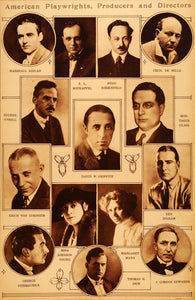 This is an original 1922 sepia rotogravure of American producers, playwrights and directors. Portraits shown include Marshall Neilan, S. L. Rothapfel, Hugo Riesenfeld, Cecil De Mille, Montague Glass, David W. Griffith, Eugene O'Neill, Erich von Stroheim, Rida Johnson Young, Margaret Mayo, Rex Ingram, J. Gordon Edwards, Thomas H. Ince, and George Fitzmaurice.