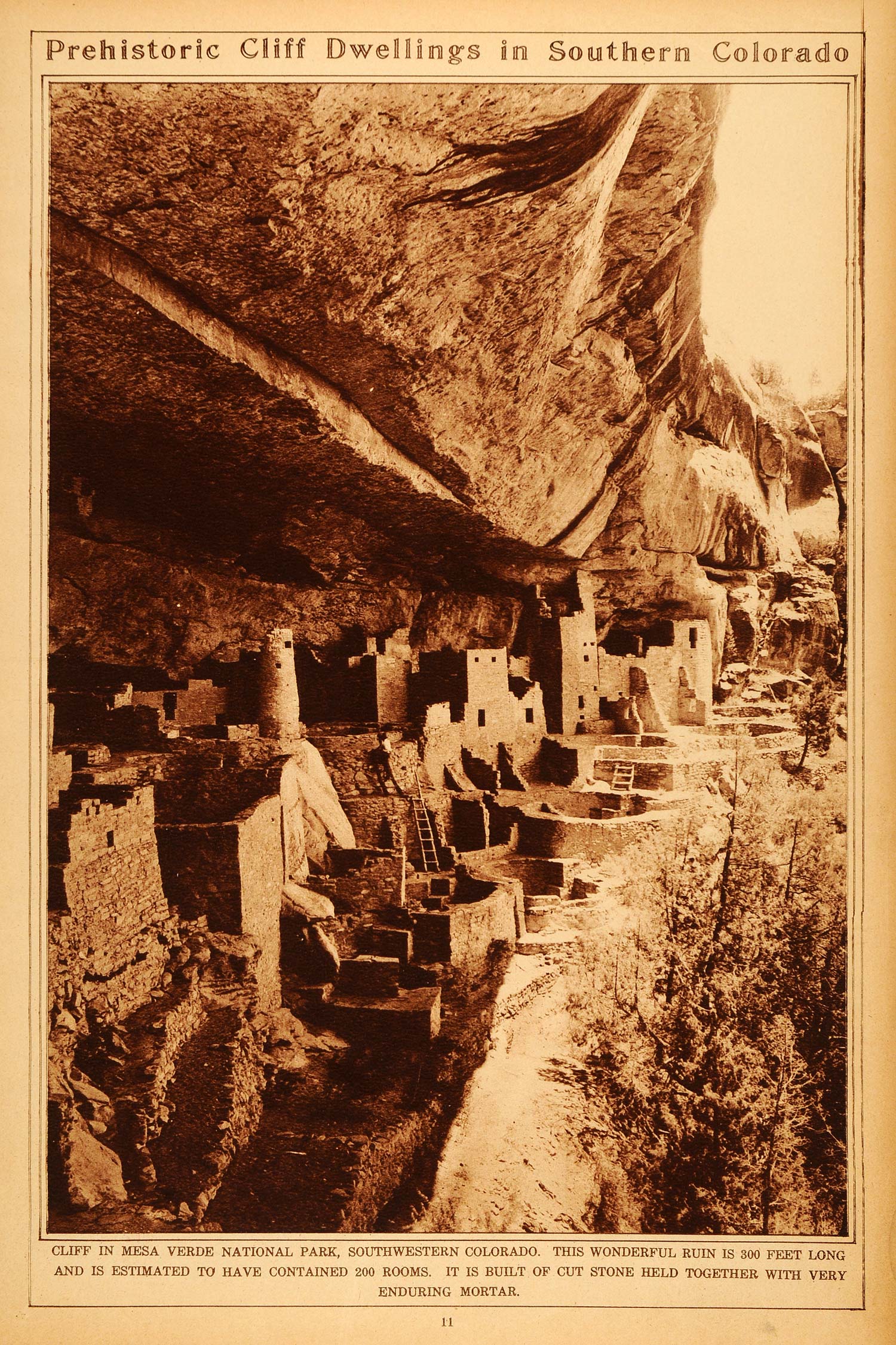 This is an original 1922 sepia rotogravure of the Puebloan cliff dwellings in Mesa Verde, Colorado. The cliff dwelling shown, named Cliff Palace, is one of several in the area. The cliff dwellings are some of the best-preserved in the entire world, and were built into the cliff face for protection from the elements. As a general rule, the deeper into the cliff face, the older the architecture, as this area was built over hundreds of years. Evidence from around the area suggests that construction of the dwellings began in 550 AD. The caption to this image writes, "This wonderful ruin is 300 feet long and is estimated to have contained 200 rooms. It is built of cut stone held together with very enduring mortar."