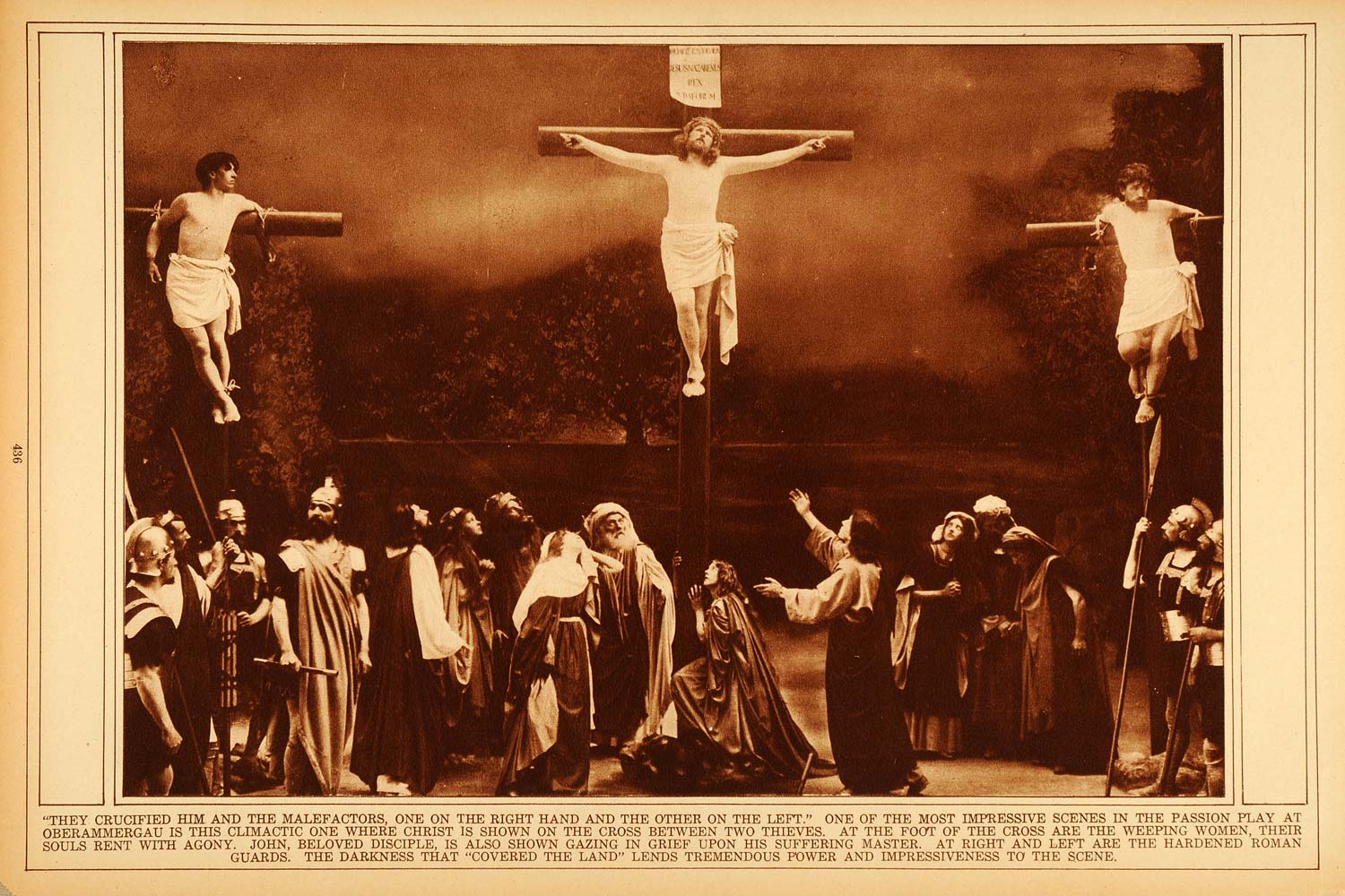 This is an original 1922 sepia rotogravure of Christ being crucified during the passion play put on by the town of Oberammergau, Germany (Deutschland). Also shown in the scene are two thieves, John, weeping women, and Roman guards. The town is famous for its Passion Play, first performed in 1634, and presented once every ten years thereafter. The citizens made a vow to God to perform the play after being spared from the bubonic plague in the 17th century. The play involves over 2,000 actors and utilizes all of the residents in the village.